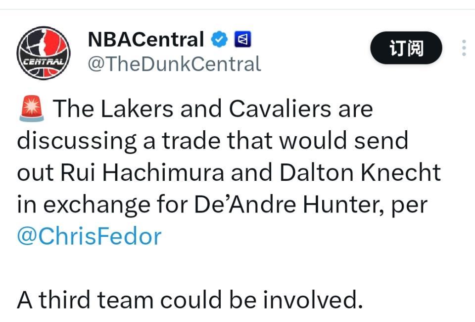 费多尔表示:“据我得到的消息,骑士与湖人已就德安德烈-亨特的交易搭建初步框架,交易主体为八村垒和道尔顿-克内克特,同时双方还计划引入第三方球队参与交易。”